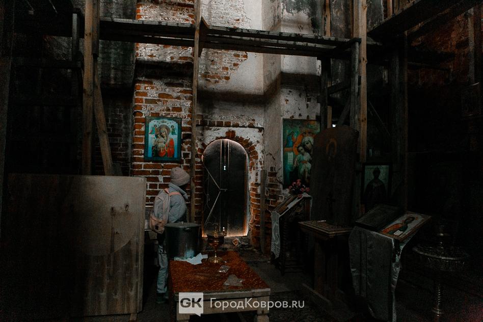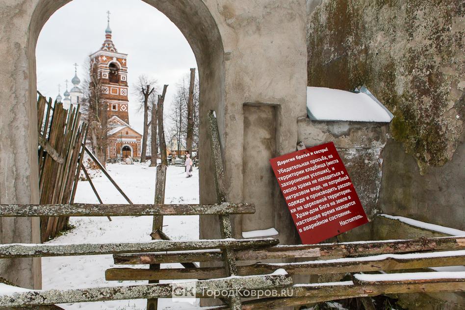 …В ноябре/декабре 2010 года получено благословение у владыки Евлогия на консервацию церкви (выведение из аварийного состояния здания церкви: установка кровли, окон/решеток, дверей, ремонт кладки-при необходимости). С декабря 2011 храм приписан к Христо-Рождественскому приходу Коврова.