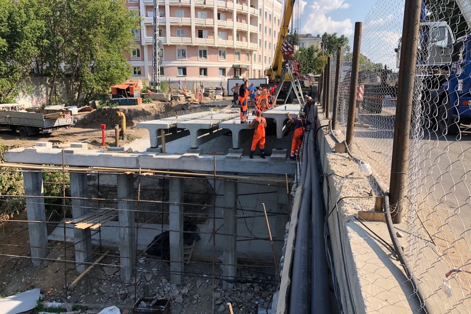 Вначале были смонтированы балки. Затем подготовлен участок сопряжения «берега» с конструкцией моста. Далее, шесть балок было заведено в зону монтажа. Работы проводились с перестановками автокрана, чтобы не повредить линии ЛЭП. Все виды работ удалось провести без блокировки движения по путепроводу.