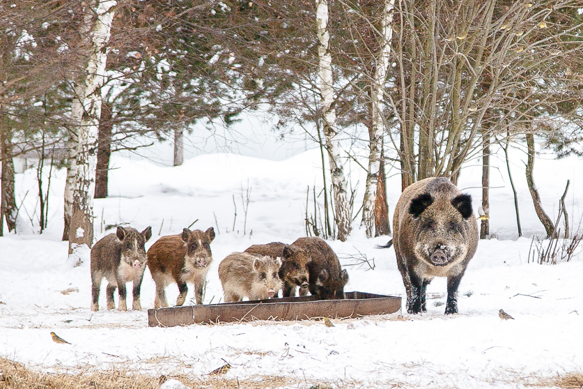 Кабанам не свойственна сентиментальность: весной, когда им не хватает белка, дикие свиньи могут полакомиться не только ушастыми зверьками, но и собственным потомством. В рацион этих всеядных животных входят также лягушки. Хотя на оборудованной людьми кормушке они обедают исключительно вегетарианской пищей. А птицы, более подкованные в вопросах полетов, чем Гога, кабанов не боятся и трапезничают здесь вместе с ними.