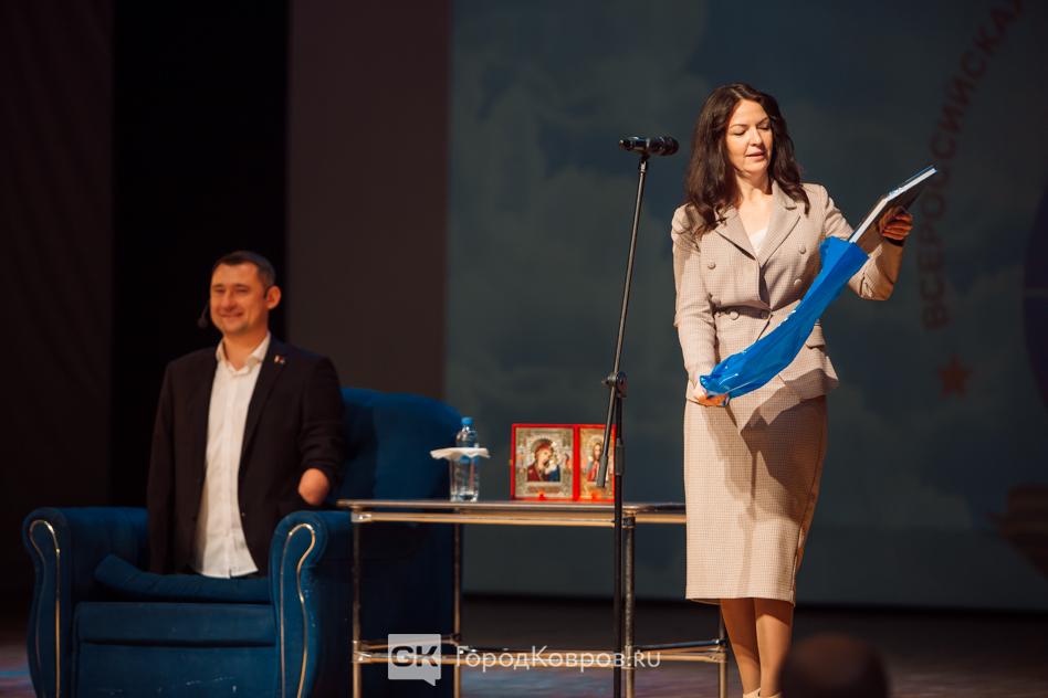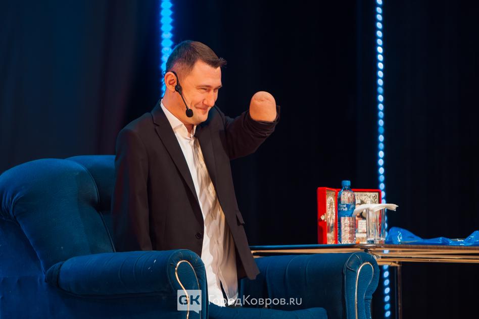 Алексей Талай рассказал о своем жизненном пути, трудностях, которые ему удалось преодолеть, силе воли и целеустремленности, ответственности за принятые решения. Он умеет вдохновлять людей, собственным примером демонстрируя, что ничего невозможного нет. Алексей Талай с гордостью продемонстрировал значок с изображением герба Коврова, поблагодарил со сцены руководителя Управления культуры и молодежной политики города Ирину Калигину, сделавшую этот памятный подарок.