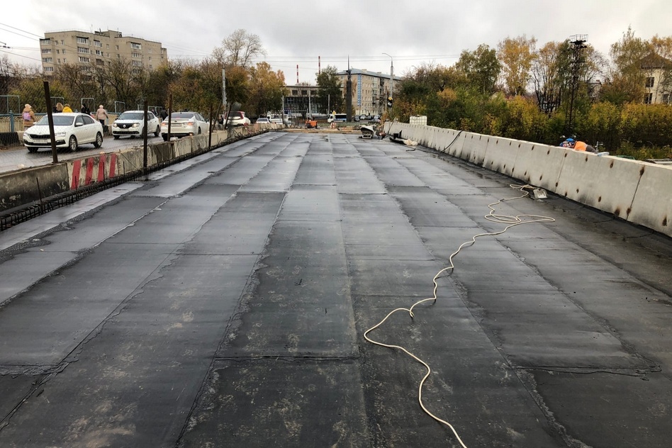 На путепроводе (Павловский мост) реконструкция правой половины вступает в завершающую стадию. В конце недели рабочие начали установку гидроизоляции.