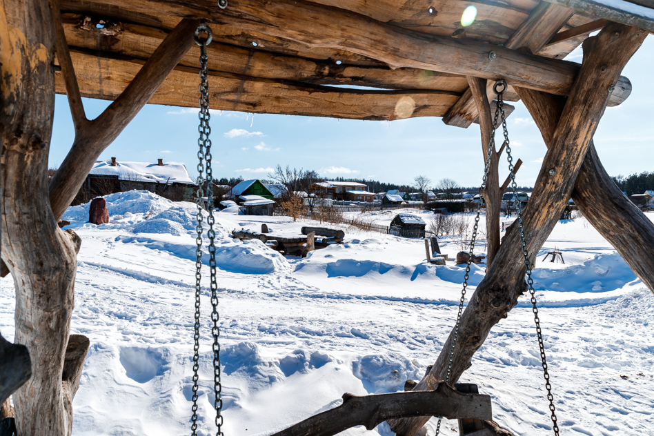 Качели повёрнуты в сторону Клязьмы. Отсюда открывается прекрасный пейзаж даже зимой.
