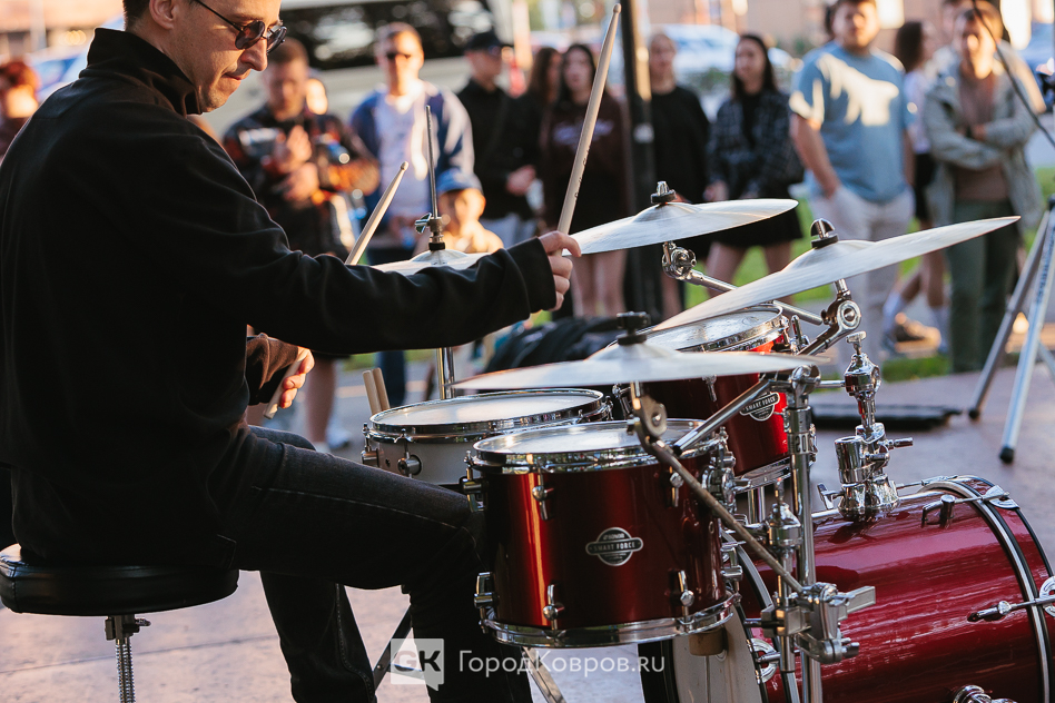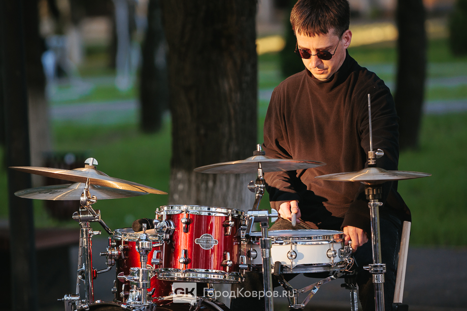 Меж тем, второй час концерта стал «отчётника» музыканта Андрея Плаченова, который давно известен в городе как профессиональный барабанщик. Он в своё время наших маржореток готовил к выступлениям, а с недавних пор преподаёт игру на ударных инструментах на базе ДК «Современник». Его проект называется «Drum Colla».