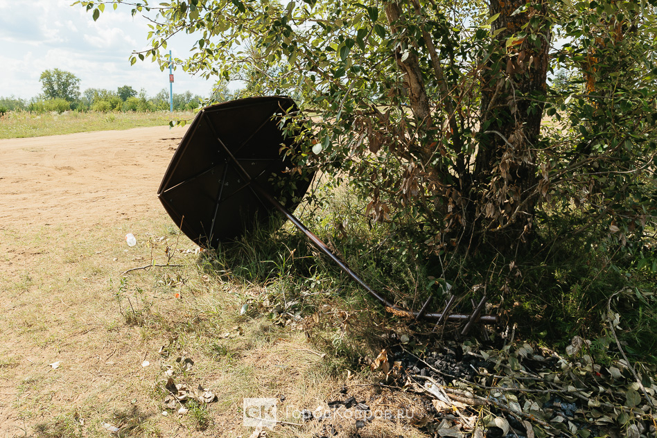И ведь точно — упёрли. Один грибок ушёл бесследно, второй валялся на дальнем конце пляжа. Видимо, обессилевшие воры не смогли донести конструкцию дальше. А обессилели они, пока выковыривали из песка третий грибок. Да, так и оставили его торчать под опасным углом над поверхностью пляжа.