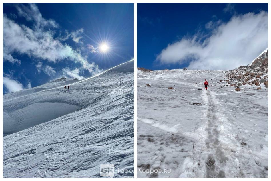 - «Тренировки и организационные встречи у нас проходили в Коврове весь этот год. Но самое главное начнётся уже в горах. Перед восхождением для нас проведут подготовительный курс, состоящий из пеших прогулок по разным рельефам местности с набором разных высот. Опытные гиды будут с нами работать все 11 дней. Будут акклиматизационные выходы, снежно-лавинные мероприятия, тренировки по удержанию при срывах на льду, работа и передвижение в связках, вязание узлов».