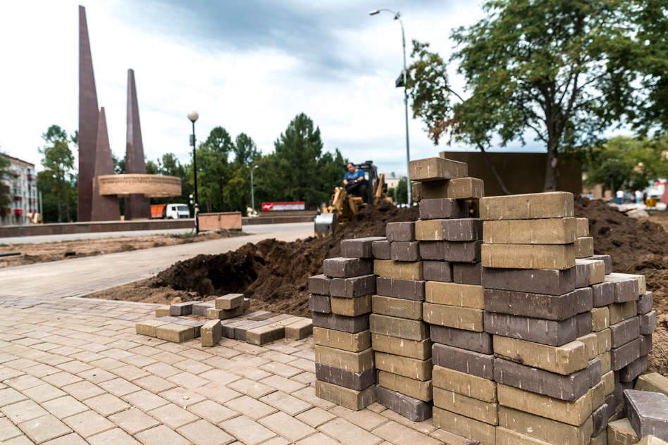 Работа на площади Победы, как и в сквере на Чернышевского, кипит. Давно «исчезли» многие деревья, аллеи — старые и новые — уже частично вымощены брусчаткой.