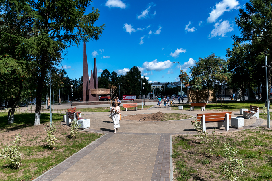 На данный момент на площади Победы вымощены дорожки, установлены скамейки и урны, в центральной части каждой из зеленых зон установлены клумбы.