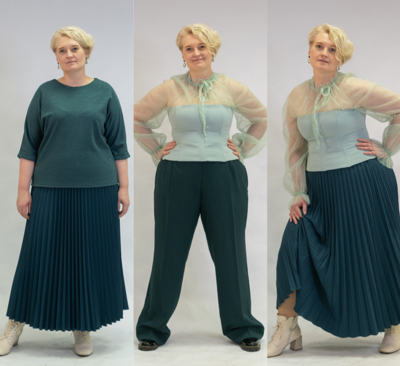 - создаём объём, используя ткани, которые хорошо держат форму, и делая акцент на узкие части тела (у Алины это талия),