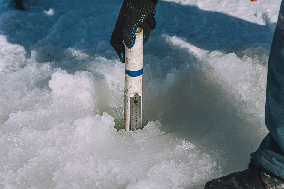 Измеряют толщину льда линейкой. Всё не так просто, как кажется на первый взгляд. Сначала делают лунку, что уже предполагает немало усилий. И только после этого делаются замеры.