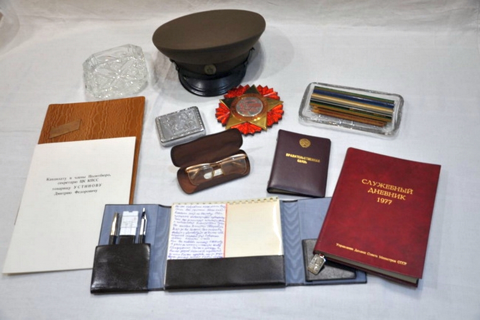 В Ковров Ольга Монякова привезла целую коллекцию раритетных, поистине бесценных вещей. Среди них – настольные блокноты, металлические ручки, серебряный портсигар, хрустальная пепельница, деловая папка, карандаши и даже полевая фуражка. Есть среди переданных вещей и подарок Дмитрий Устинову от трудящихся города Коврова, датируемый 1980 годом.