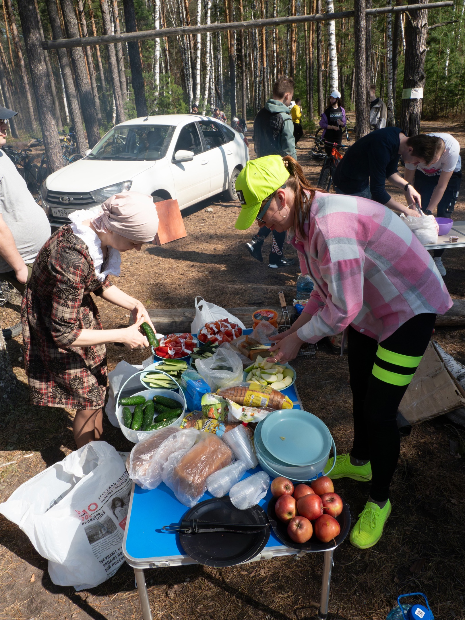 А если вернуться, к субботнему дню, то в лесу у ребят программа выдалась насыщенной. Естественно после заезда обязательная часть это приготовление стола — овощи, мясо, сосиски на костре.