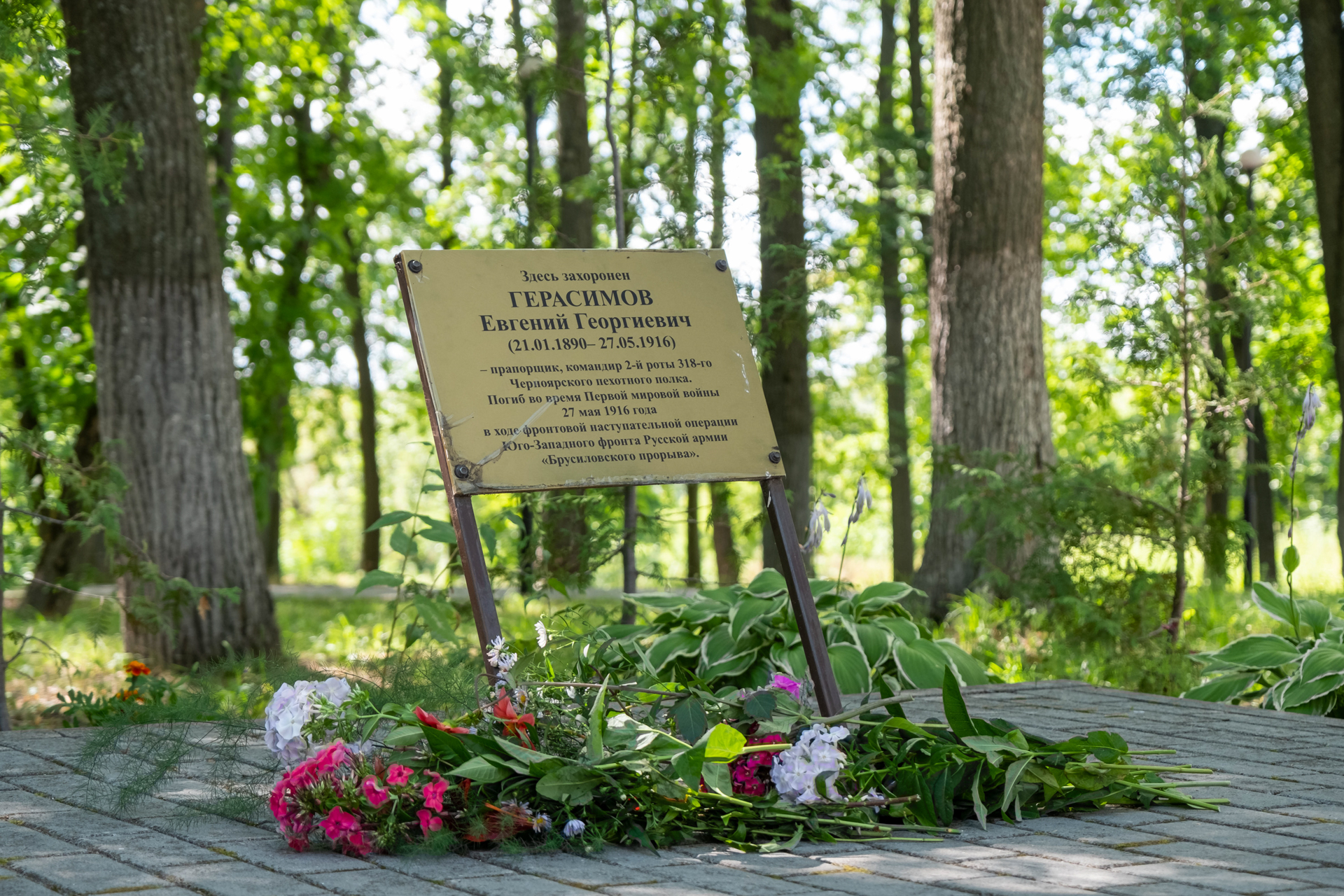 Цветы возлагали и к могиле Евгения Герасимова, прапорщика, командира второй роты 318 пехотного Черноярского полка. Евгений Герасимов ушел на фронт добровольцем, причину своего решения солдат описал в своих письмах, которые хранятся в ковровском музее. Всего в коллекции 16 писем.