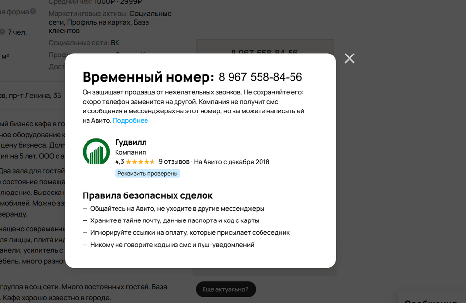 Александр признал, что адрес в объявлении не совпадает с адресом объекта, выставленного на продажу. По его словам, собственник кафе не хочет раньше времени нервировать коллектив кафе. Но и нам (мы-то представились потенциальными покупателями) адрес в разговоре по телефону не сообщил, предложил переключиться на вотсап.
