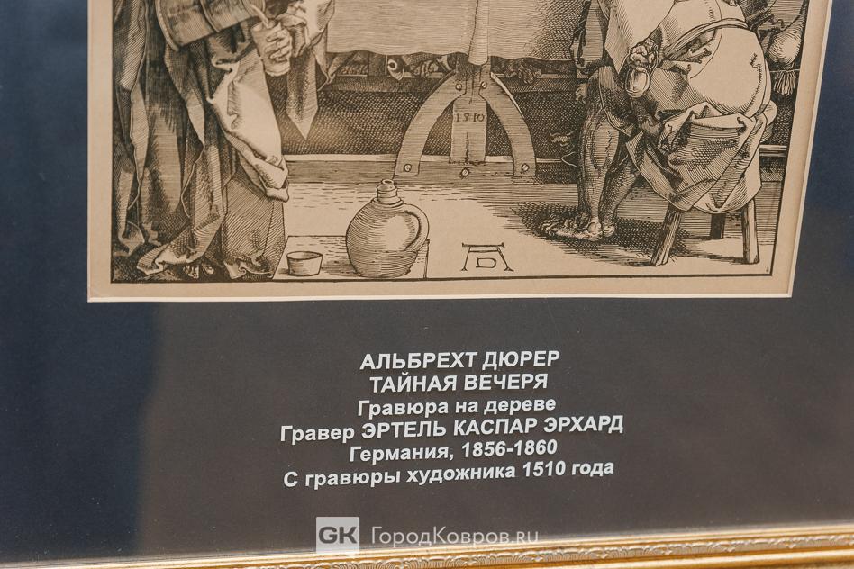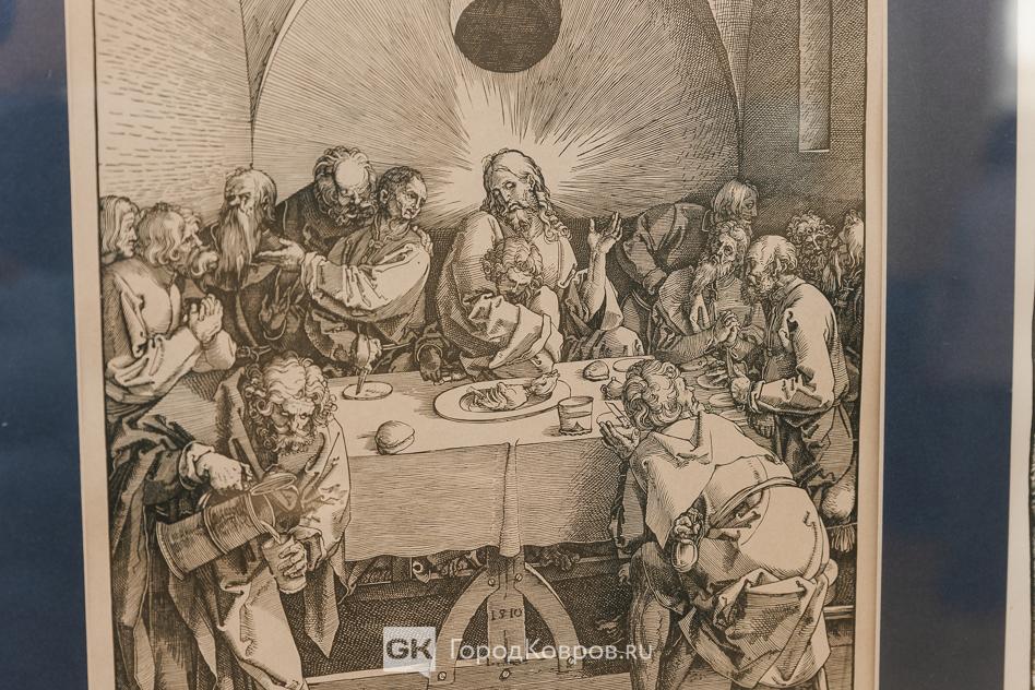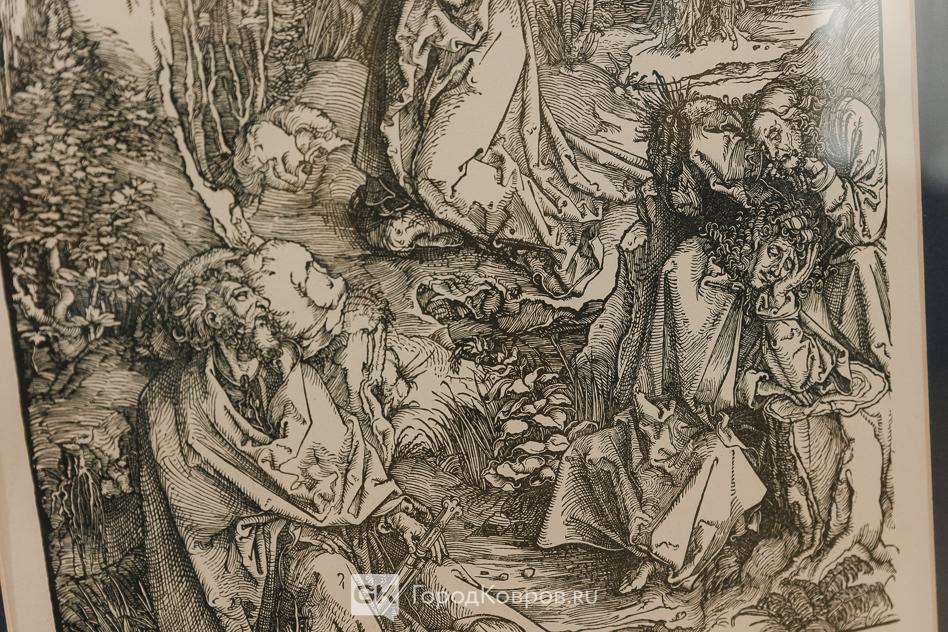 «Величайшим мастером ренессансной гравюры стал Альбрехт Дюрер. Во-первых, он подхватил и развил все лучшее, что было достигнуто в немецкой графике. Во-вторых, автор обогатил её итальянским стилем. В-третьих, Дюрер по-настоящему поднял гравюру вровень с другими видами изобразительных искусств. Творчество Дюрера — это, во-первых, интеллектуальная мощь; во-вторых, духовная наполненность; в-третьих, богатство фантазии; в-четвертых, техническое совершенство. Его творчество не имело равных среди современников. Посетителей выставки впечатляют удивительные по драматизму работы Дюрера из серий «Большие страсти» и «Апокалипсис». Эти гравюры выполнены известным немецким художником и гравером Эртелем Каспаром Эрхардом в технике гравюры на дереве в 1856-1860 годах».
