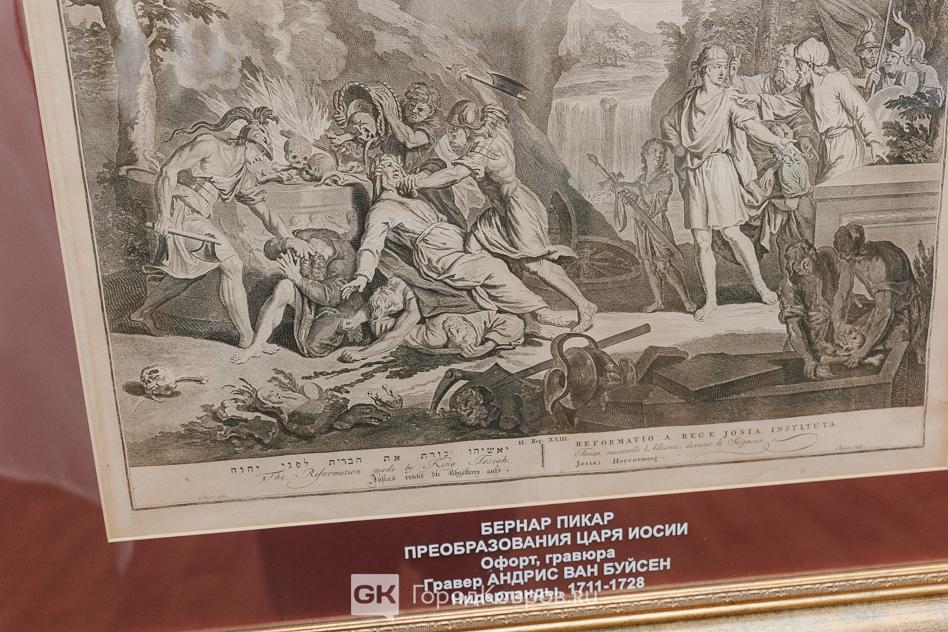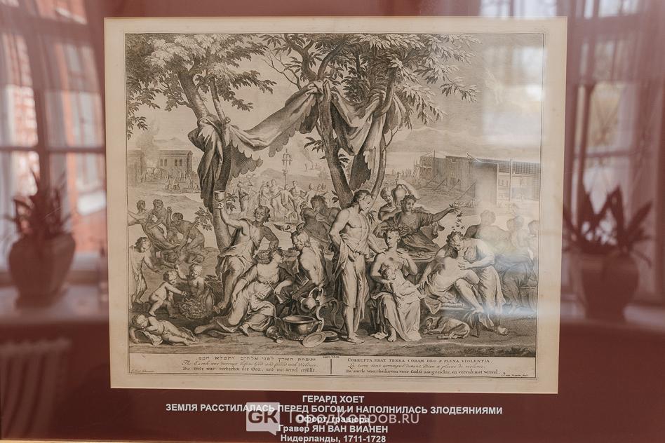 «Вслед за Германией гравюра становится уделом творчества великих голландцев. Начало XVIII столетия стало временем расцвета искусства гравюры и бума на иллюстрированные Библии. Их стали издавать частные типографии Амстердама и других городов. Они представляли собой альбомы гравюр в полный лист, подробно изображавших события Священной Истории. Сюжеты — от Сотворения мира до Апокалипсиса с краткими подписями. Одним из самых известных и амбициозных стал альбом гравюр «Фигуры из Библии». Альбом вышел в 1728 году и вобрал в себя самые совершенные работы за период с 1700 по 1728 годы. Славу альбому принесли выдающиеся художники и граверы. Выделяются следующие авторы. Во0первых, Герхард Хоет; во-вторых, Бернар Пикар; в-третьих, Джованни Ланфранко; в-четвертых, Шарль Лебрен и другие. Работы перечисленных авторов демонстрируются на выставке».