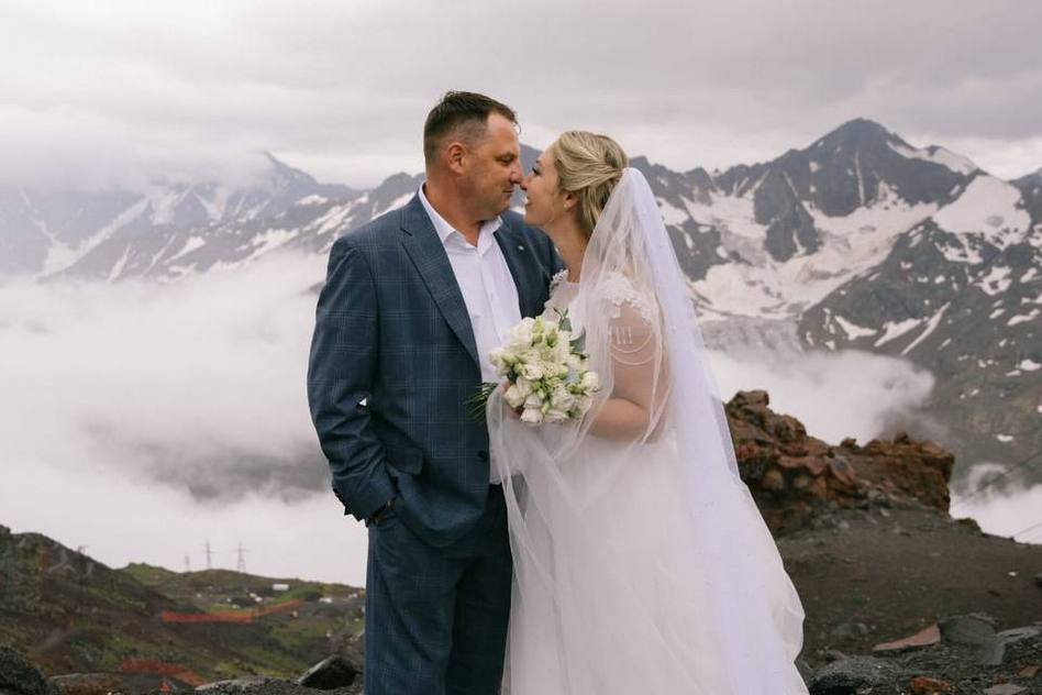Кристина и Антон — молодожёны, чья любовь связана с самой высокой точкой России — Эльбрусом.8 августа необычная церемония бракосочетания прошла прямо на склонах Эльбруса — на высоте 5100 метров.