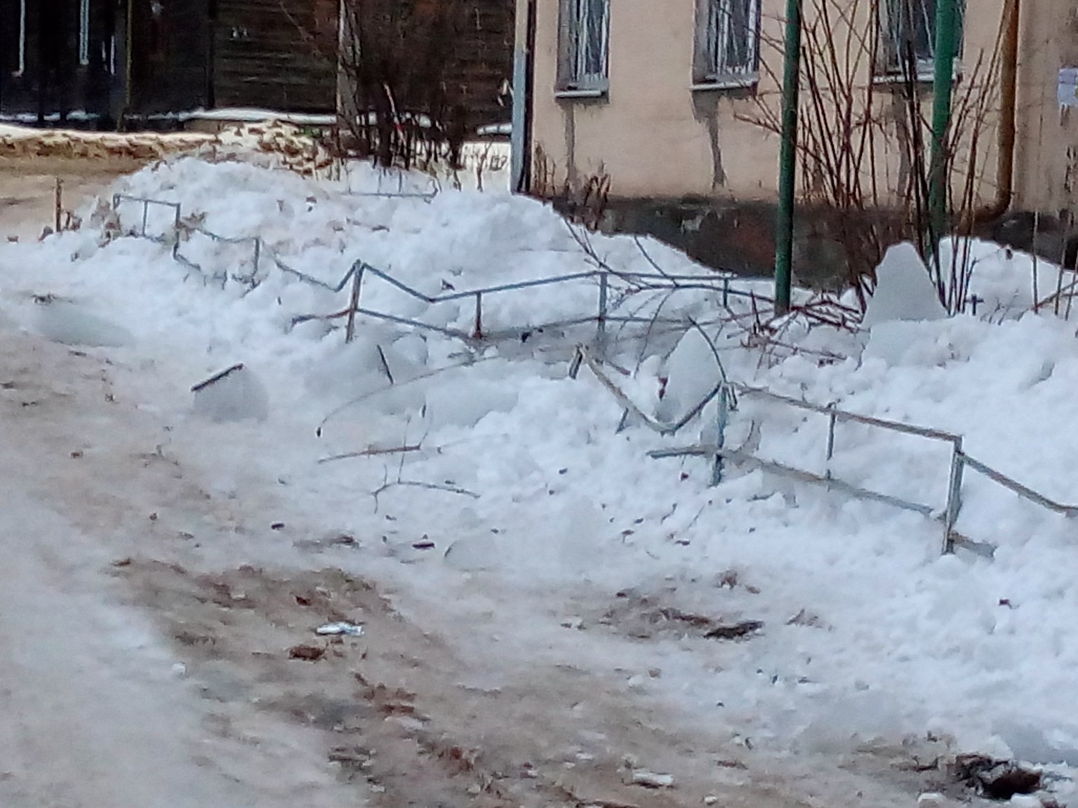 -после падения снега, льда (сосулек) с края крыши, снег и лед могут сходить и с остальных частей крыши, поэтому, если на тротуаре видны следы ранее упавшего снега, или ледяные осколки, то это указывает на опасность данного места;