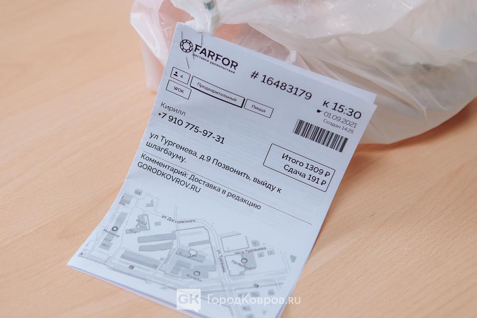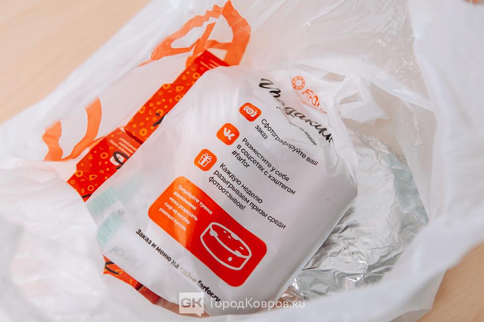 Еду в фирменной сумке привёз курьер по имени Михаил. Он сообщил, что он только начал работу и наш заказ у него уже десятый по счёту.