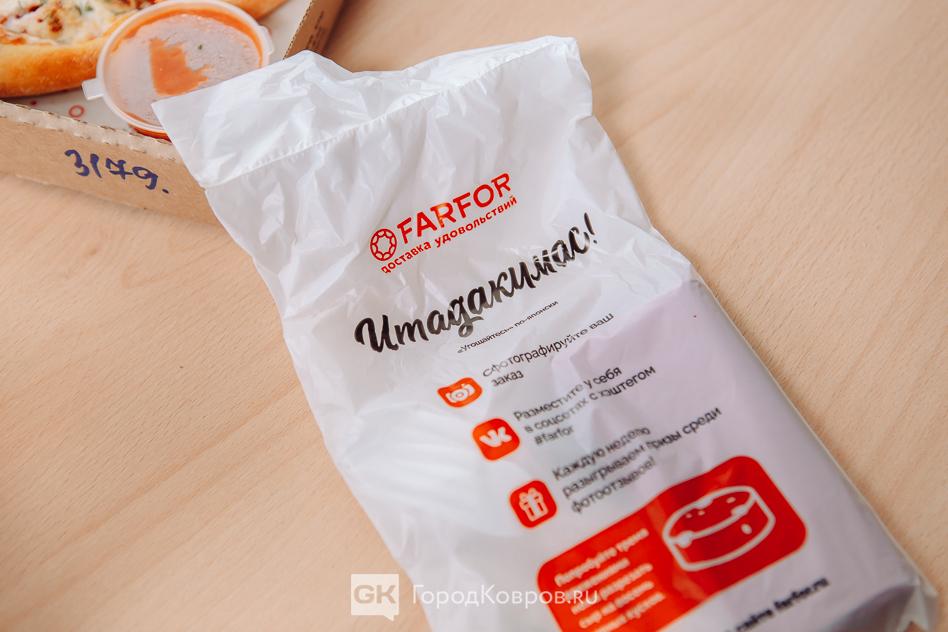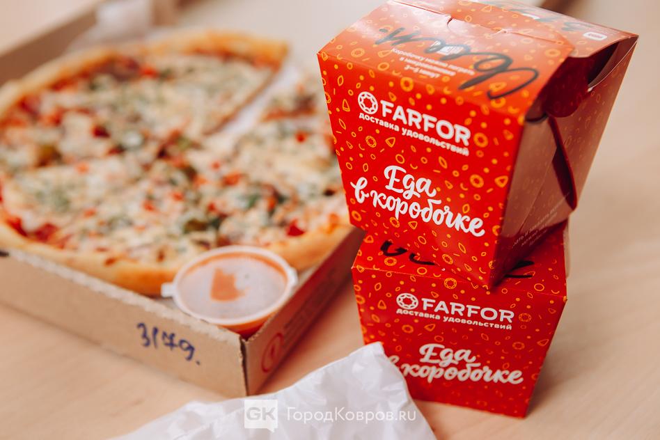 Непременно будем ещё заказывать, мы ведь толком не распробовали, а там ещё десерты есть, салаты и… Вот, над чем ресторану «FARFOR» в Коврове надо работать, так это над формированием пиццы из половинок. Было бы здорово на компанию из нескольких человек заказать разные виды, чтобы не спорить, что лучше — с морепродуктами или с копчёностями.