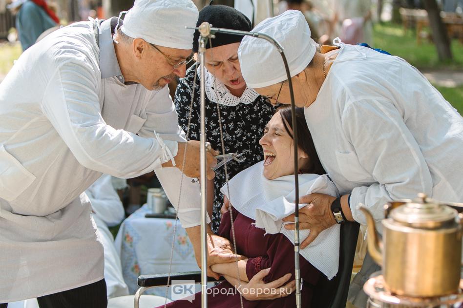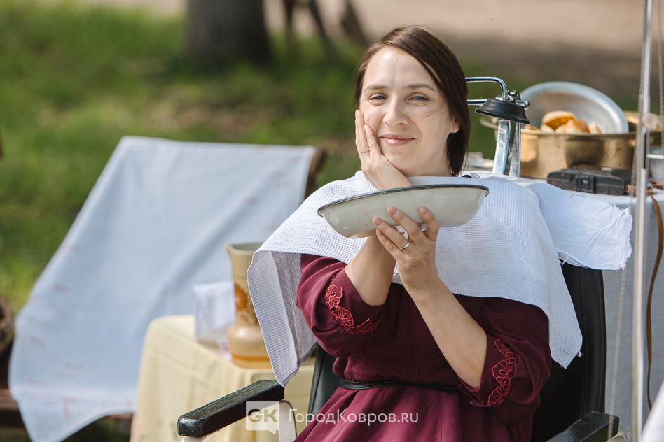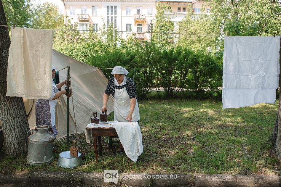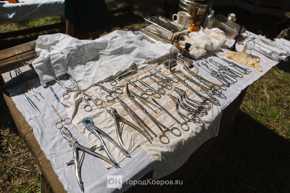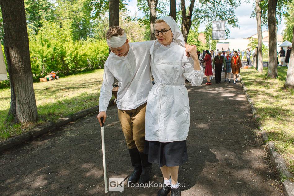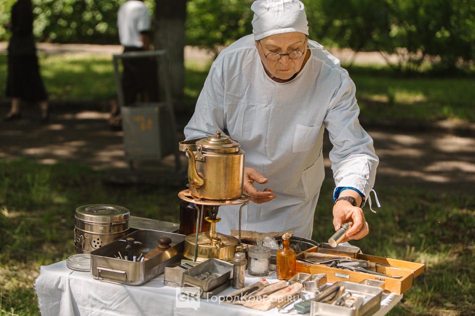 …Двойную функцию несла в себе медицинская локация. Больница мирного периода трансформировалась в госпиталь. Кстати, для Коврова это очень верная история. Раненых в наш город привозили очень много в период битвы за Москву. На реконструкции были воспроизведены не только костюмы медиков, но и хирургическая операция. Со стороны всё выглядело натурально, вплоть до крови пациента после «надреза» скальпелем.