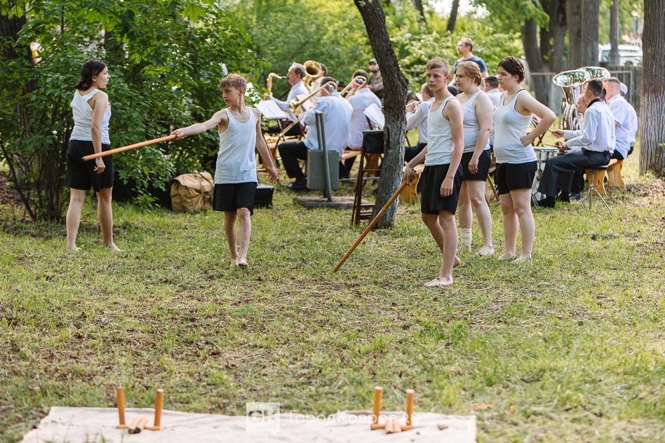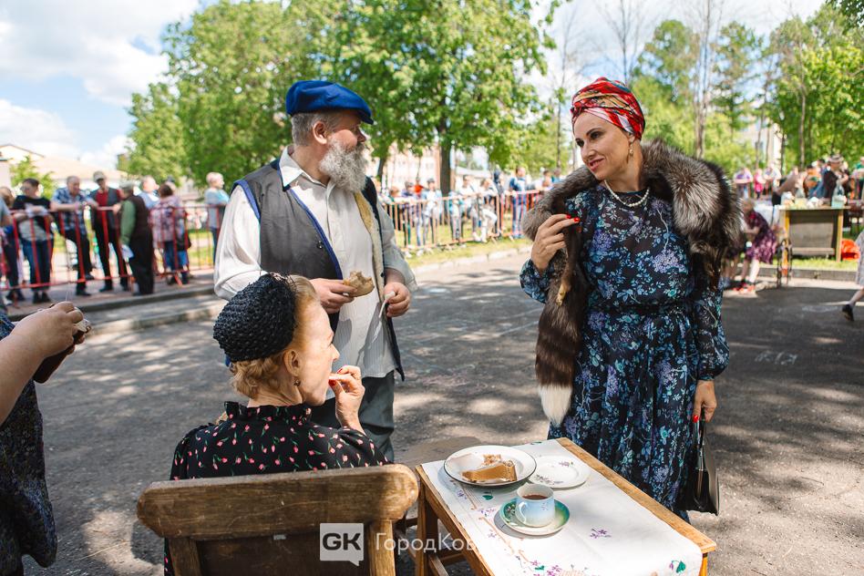 …Отдельной локацией стала имитация двора многоквартирного дома. Соседи того периода жили дружно, активно общались, как правило во дворах. На дворовой скамейке было задействовано пятеро реконструкторов. В их числе – юные участники. Детям было интересно узнать, какие игры были популярны у их ровесников в 40-е. Про скакалку девчонки знали, а вот про резиночку узнали в ходе мероприятия.
