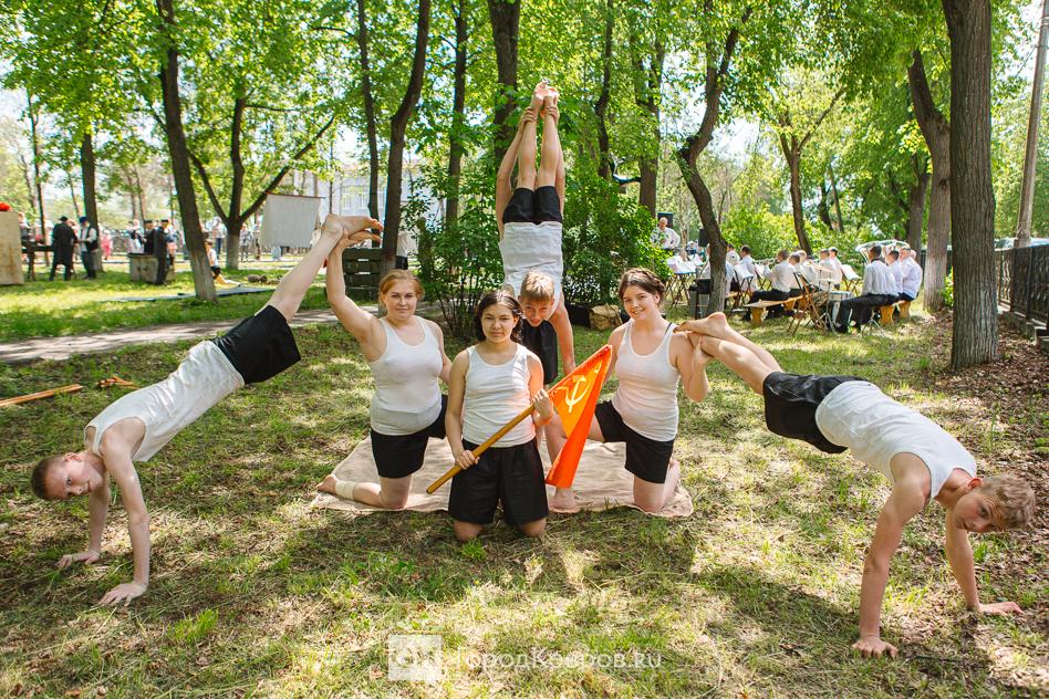 …Условный городской парк, по которому гуляют горожане. Играет духовой оркестр. По проезжей части (ею стала центральная аллея сквера) курсируют автомобили и грузовики. Ретромобили – это автопарк сообщества «Наследники Победы», которые дополнили транспортные средства реконструкторов из других городов.
