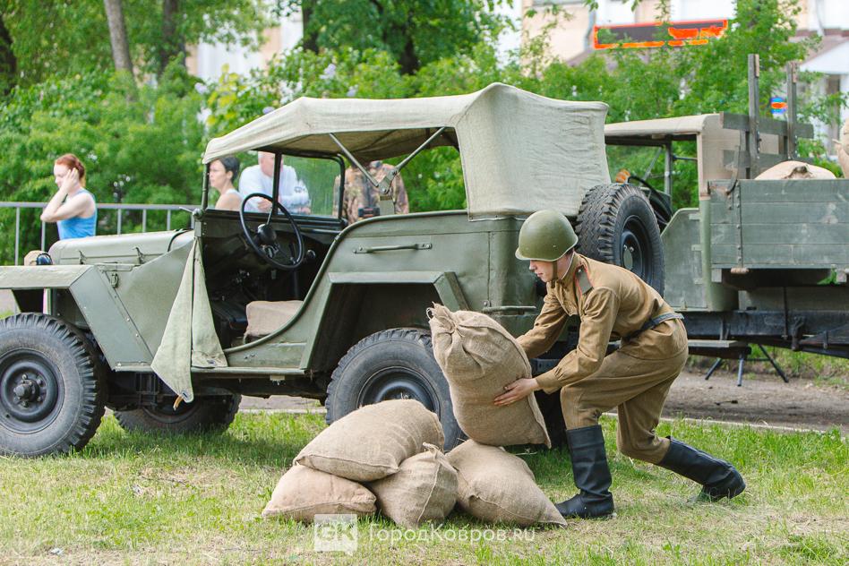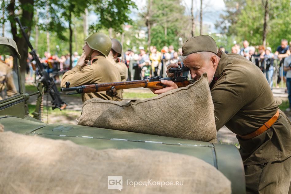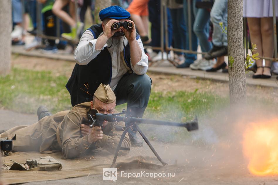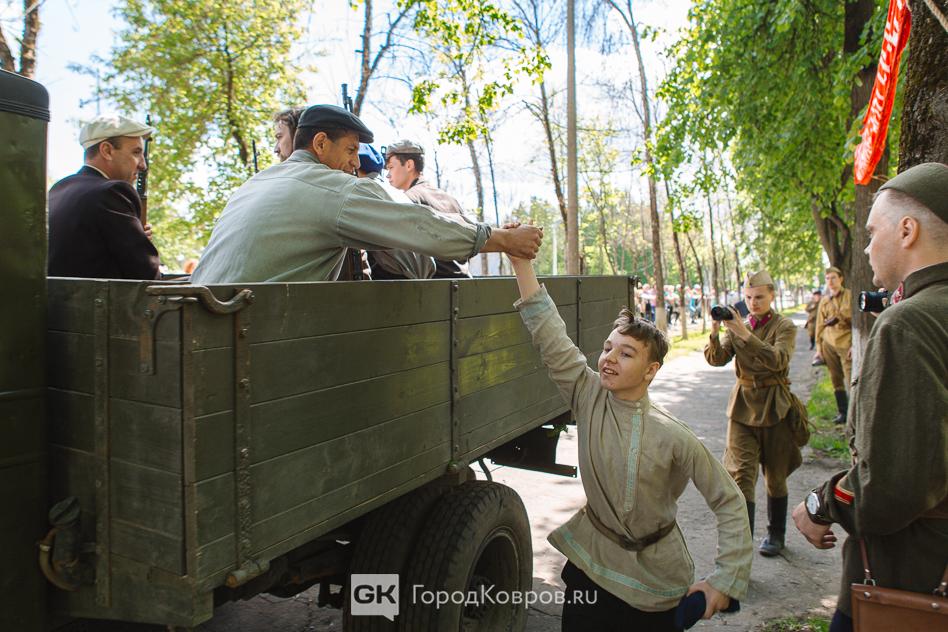 …Военные эпизоды в реконструкции стали наиболее зрелищными. Один пролёт самолёта чего стоит! В социальных сетях потом гуляли фото с подписью «бомбардировщики в небе над Ковровом». На самом деле самолёты на реконструкции были условно-воображаемые. Их пролёт передавала аудиозапись звука летящего истребителя.