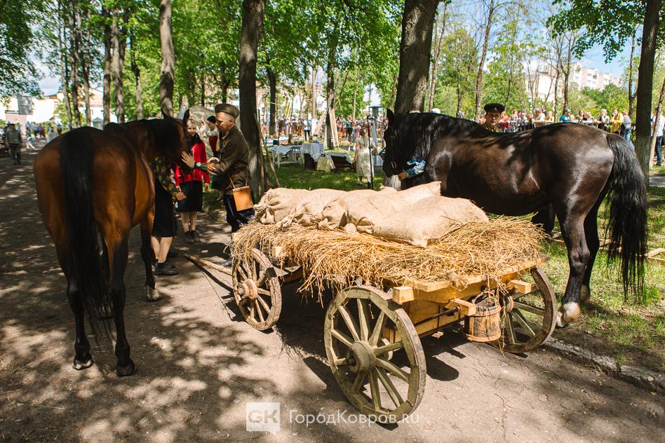 …Мирную жизнь передавала локация «Колхозный рынок». Там в качестве реконструкторов выступали не только люди, но и животные. Живой петух и лошади, которые и вовсе стали активными участниками на фестивале. Их водили, на них ездили, запрягали и распрягали…