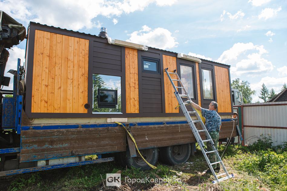 После того, как к ангару подъехал манипулятор, готовую мобильную баню в считанные минуты установили и укрепили на автомобиль-перевозчик. далее — мы отправились следом, чтобы посмотреть, как проходит монтаж под ключ на участке заказчика. Путь лежал в деревню Брызгалово Ковровского района.
