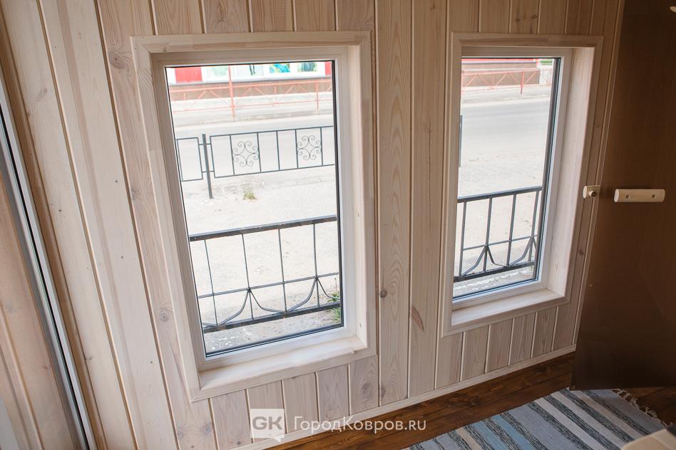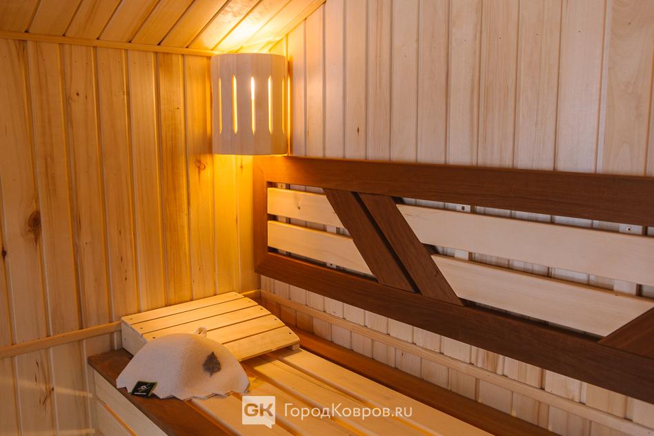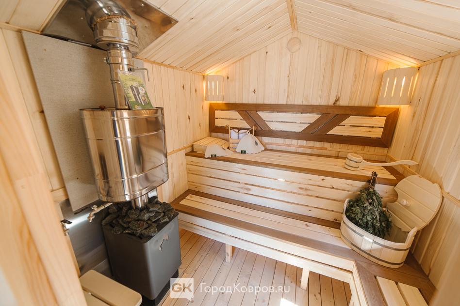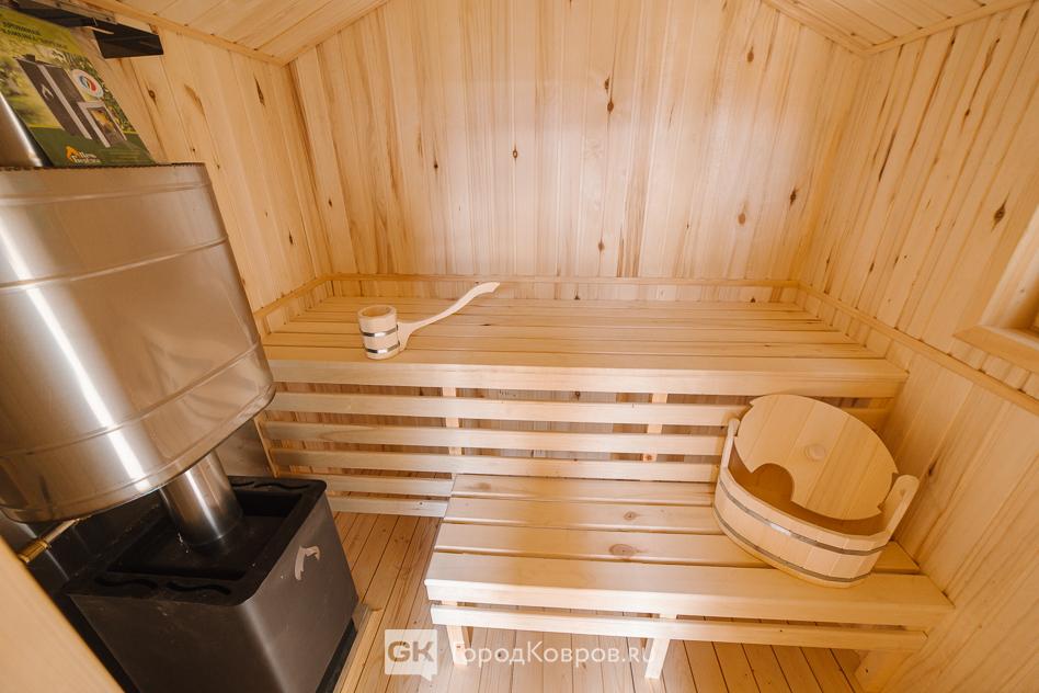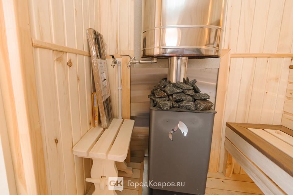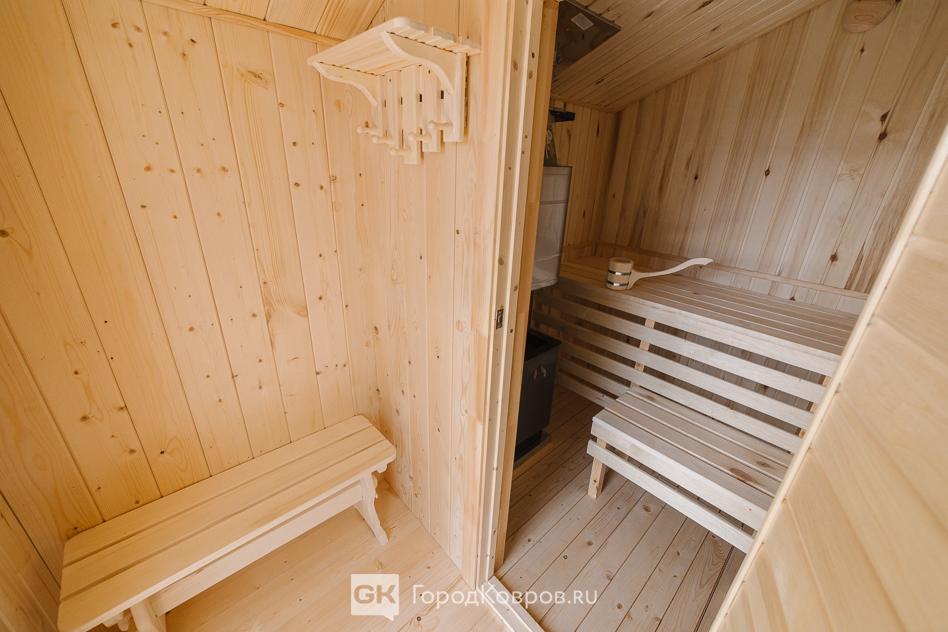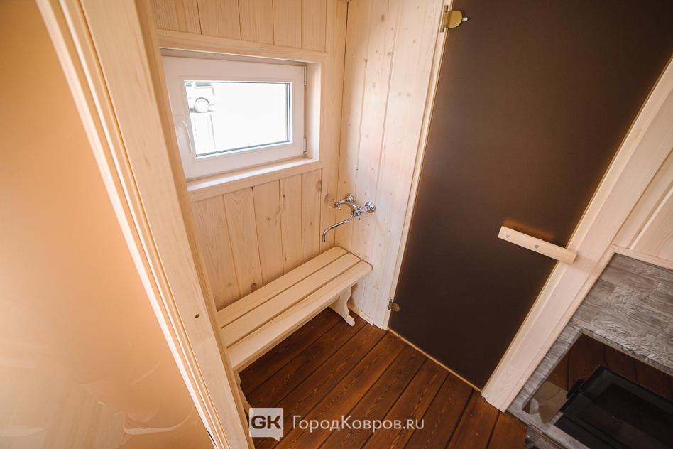 И наконец, парная. Два на два метра, площадь четыре квадратных метра. Обшита вагонкой из осины, на полу доска из лиственницы.