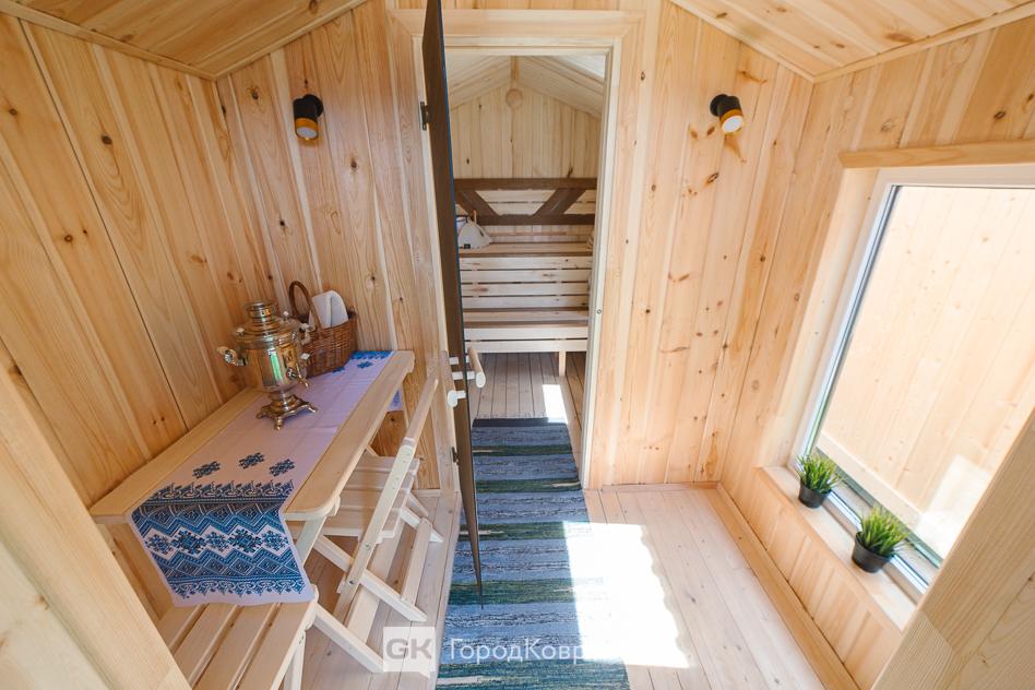 Просторная комната отдыха имеет размер 2х2.5м, где вполне можно разместиться семьёй или большой компанией. Она обшита имитацией бруса, на полу- шпунтованная доска.