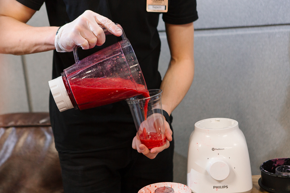 Пока всё это обсудили с Ильёй, участницы МК под руководством поваров «VITAE» уже закончили приготовление котлет, управились с салатной зеленью и приступили к приготовлению смузи (котлеты тем временем отправились в конвекторную печь). Для приготовления смузи, как известно, нужно немного — фрукты или овощи, хороший блендер и кулинарная фантазия.