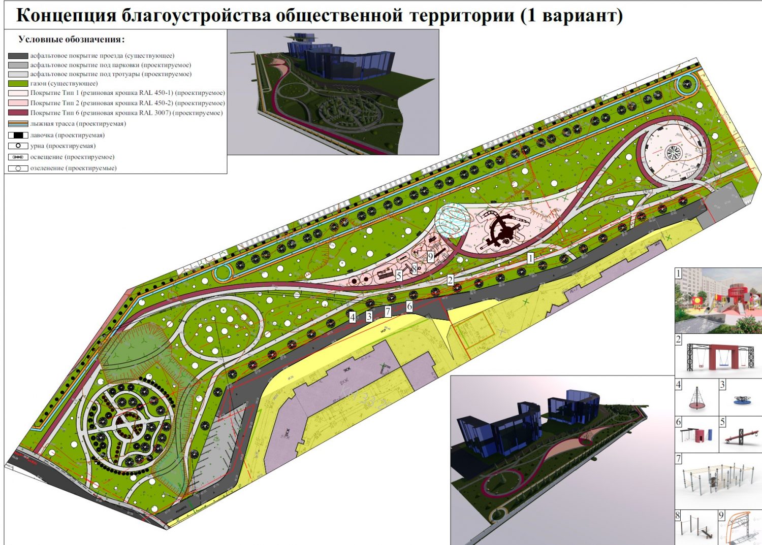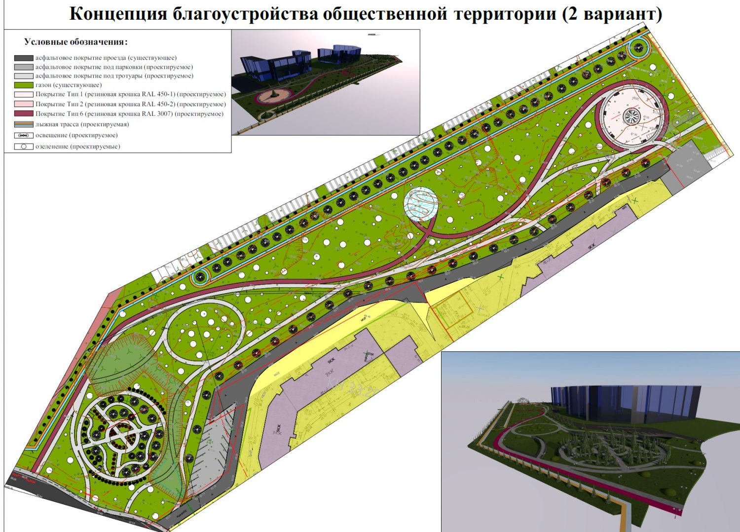 Первый вариант — комплексное общественное пространство. Он был разработан на основе мнения многих жителей, желающих сохранить активные зоны отдыха. Проект предполагает не только модернизацию существующих детских площадок, но и добавление спортивного комплекса для воркаута. Архитекторы подобрали малые архитектурные формы, которые должны стилистически связать жилую застройку и промышленное предприятие. В план включена лыжная трасса, масштабное озеленение (в том числе для визуального экранирования заводского ограждения) и специальная зона для мероприятий, где можно будет устанавливать новогоднюю елку и проводить дворовые праздники. Также была скрупулезно проработана сеть дорожек с учетом реальных маршрутов движения людей.