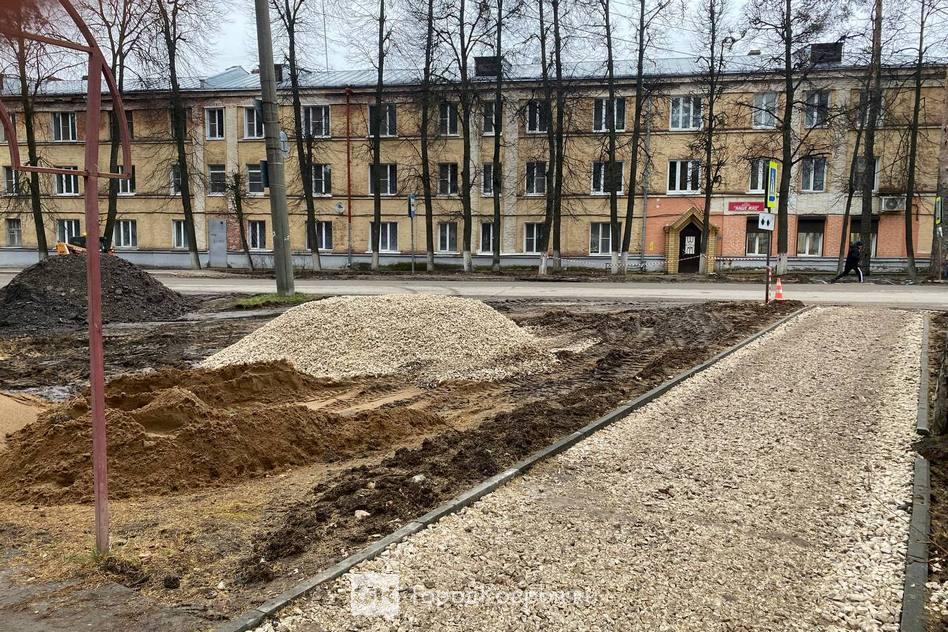 Еще не закончили асфальтировку возле перекрестка. Там сегодня груды песка и щебня. При этом техника и рабочие переместились на Тимофея Павловского. Там ровняют тротуар и укладывают щебень.