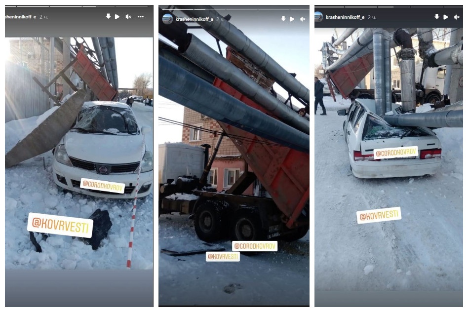 Днём на территории Коврова, на улице Муромской 39-летний водитель грузового автомобиля «МАЗ» проехал под надземной теплотрассой с поднятым кузовом (самосвал). Кузов повредил теплотрассу, привёл к падению труб на припаркованные рядом легковые автомобили. Всего пострадало четыре транспортных средства: «ВАЗ-2114», «Nissan Tiida», «Mitsubishi Lancer», «Renault Kaptur».
