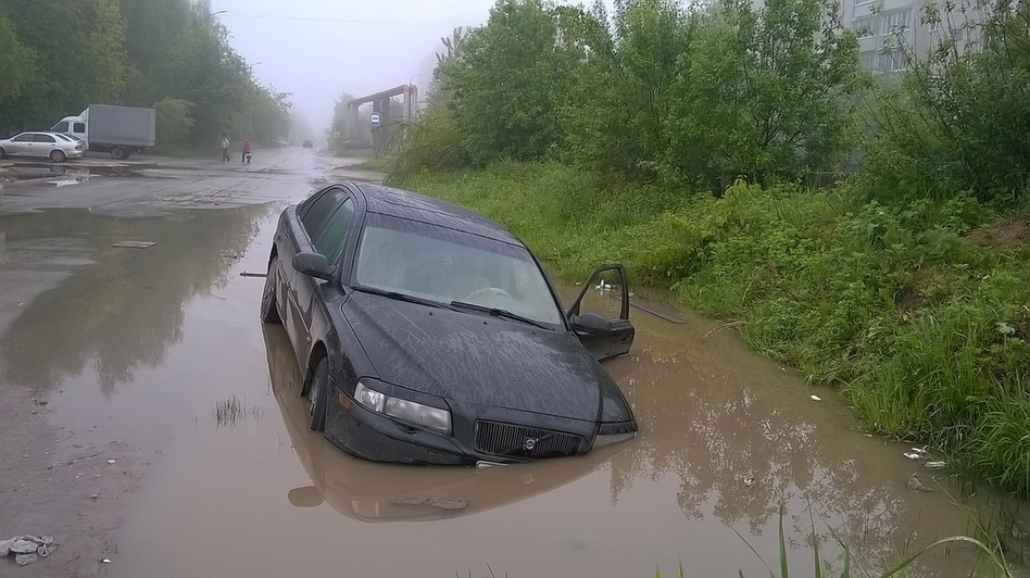 PS. Что произошло на самом деле, пока неизвестно. В соцсетях есть версия, что это последствия ДТП. Однако, как говорится, факт «на лицо» и на фотографии: автомобиль левой стороной действительно увяз в луже по самый капот.
