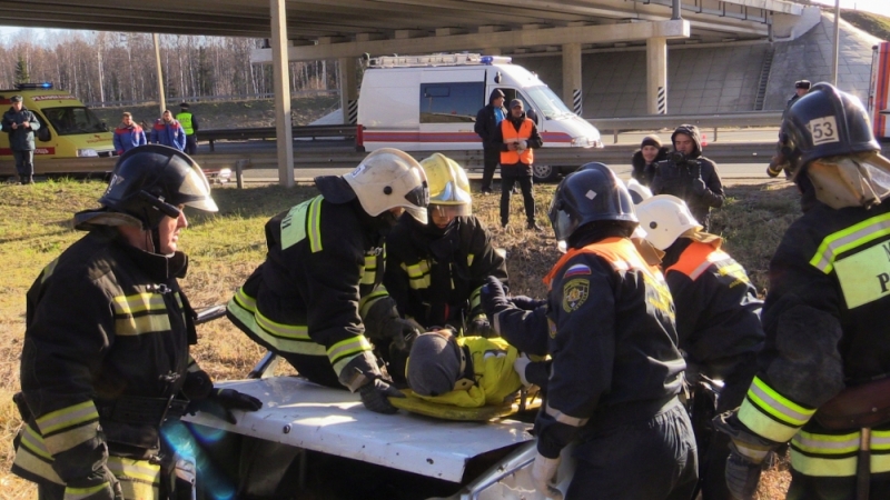 Участники учения отрабатывали совместные действия по двум вводным. Согласно первой легенде, водитель легкового автомобиля «ВАЗ 2115», двигаясь в сторону Москвы, не справился с управлением. Автомобиль, опрокинувшись через металлическое барьерное ограждение, упал с моста. В результате в машине оказались заблокированы водитель и пассажир. Возникла угроза возгорания двигательного отсека автомобиля.