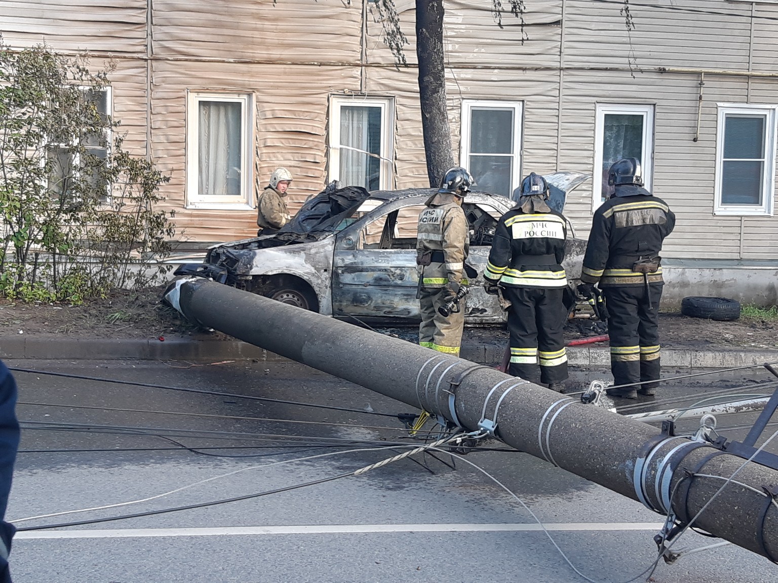 26 мая в 04-45 возле дома № 204 по ул. Дегтярева произошло ДТП. Автомобиль Рено врезался в бетонный столб, в результате произошло возгорание автомобиля. Автомобиль сгорел полностью. Пострадала отделка дома, возле которого горел автомобиль.