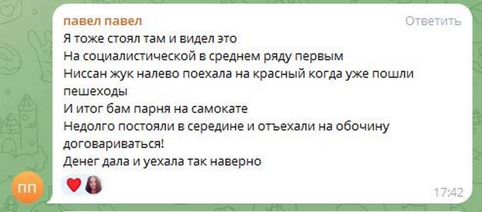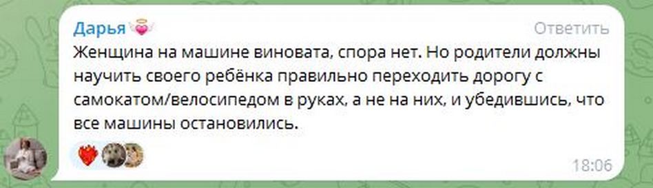 - «Как так? Произошла авария, пострадал ребёнок. И никто официально не обращается в правоохранительные органы! То, что ребёнок, как говорятся, «встал и пошёл», ещё не означает, что с ним всё будет хорошо. А что если сотрясение мозга проявится симптомами через несколько часов?..».