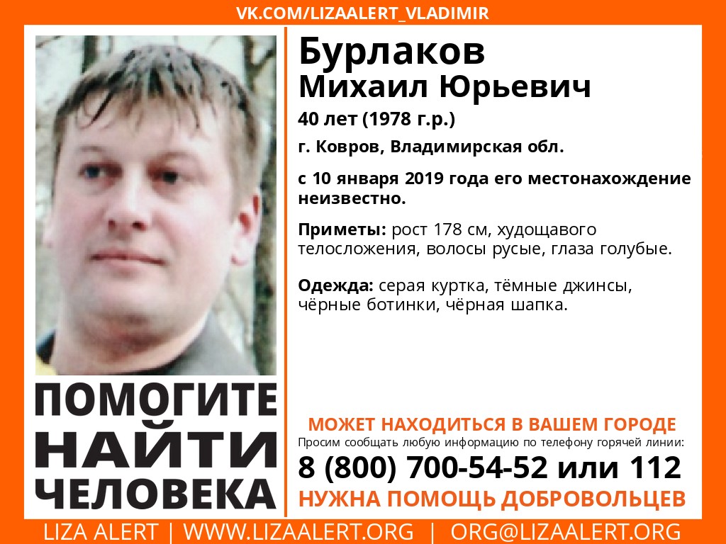 Как сообщают волонтёры отряда, Михаил Юрьевич Бурлаков пропал 10 января, до сих пор о его местонахождении ничего не известно.