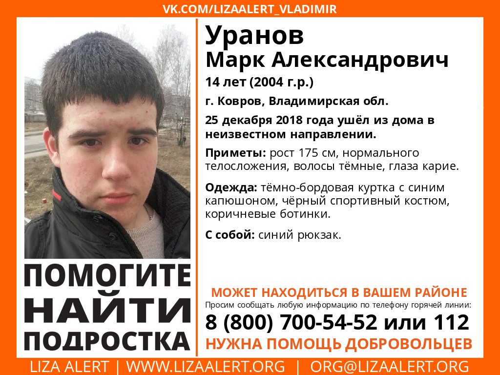 В Коврове пропал подросток. 14-летний Марк Уранов ушёл из дома 25 декабря и до сих пор не вернулся.