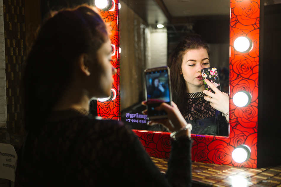 К гримёрному зеркалу девушки подходили поочерёдно, по двое-трое. Как только причёски-образы были завершены, очерёдность у зеркала менялась.