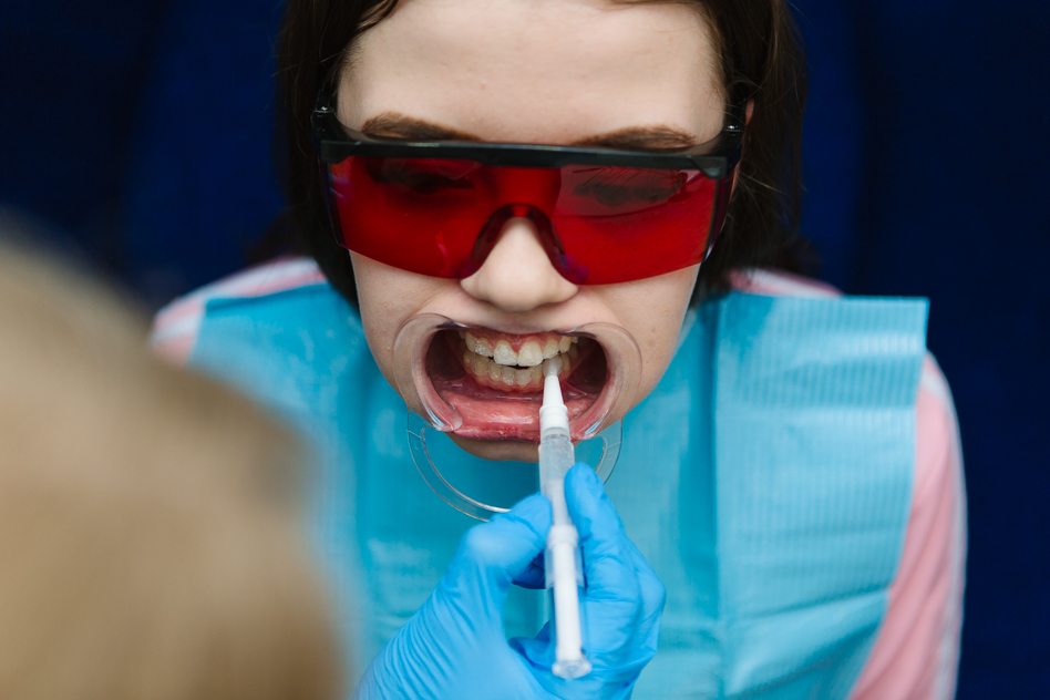 Мы морально поддерживали Аделину в первые 20 минут, пока её устраивали в кресле, фиксировали рот и наносили отбеливающий гель. Далее девушке предстояло подвергнуться специальному облучению, которое в совокупности с гелем и даёт отбеливающий эффект.