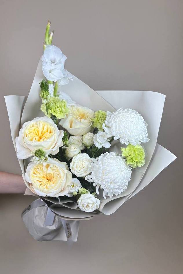 Матовые полупрозрачные плёнки, выполняющие роль изящной рамы, и оттенки в духе Cloud Dancer — идеальный выбор. Их задача — не конкурировать с букетом, а мягко его дополнять и подчёркивать.
