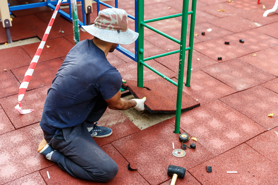 Здесь уже стоят столы для настольного тенниса, рядом укладывают мягкое покрытие на спортивной площадки.