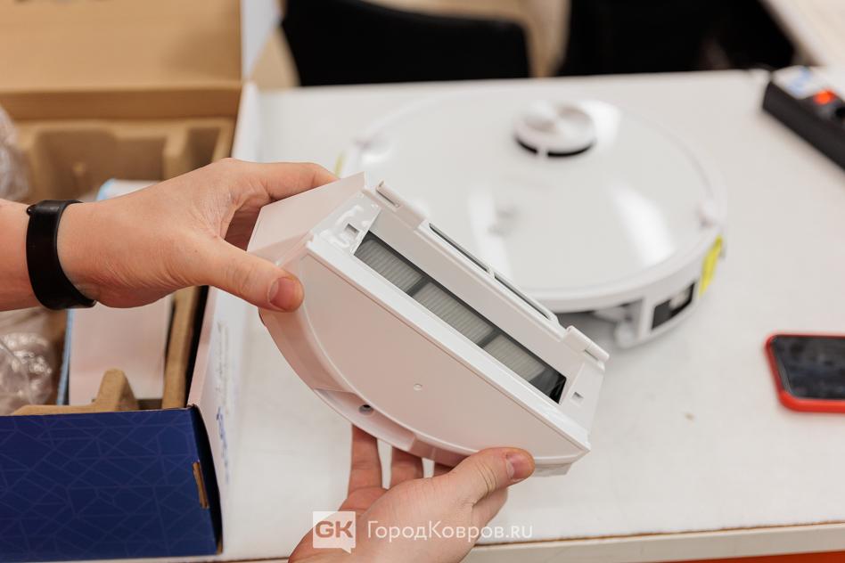 Менеджер Евгений взял с полки один из роботов-пылесосов, оснащённых такими датчиками, открыл упаковку и показал, как выглядят датчики.