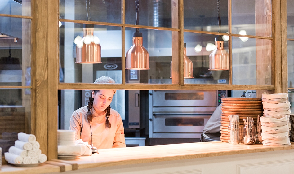 Открытая кухня. Это, пожалуй, нечто особенное. Красиво! Что готовят на этой кухне? Меню — на сайте «Довольный Кот».