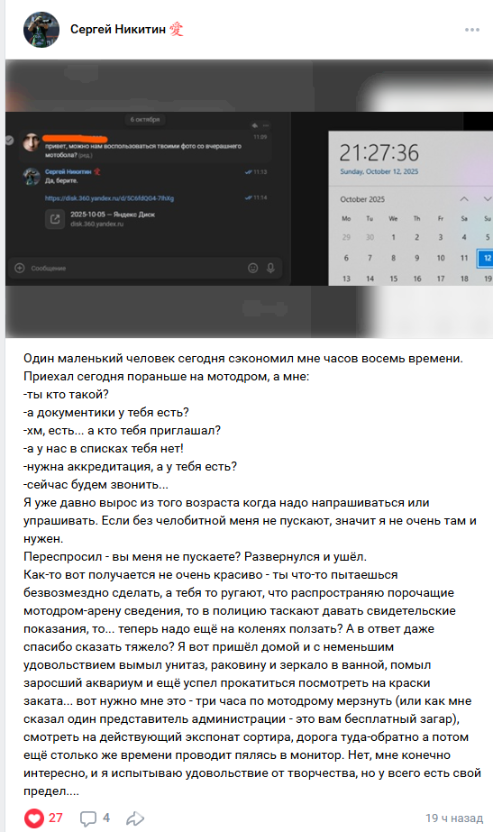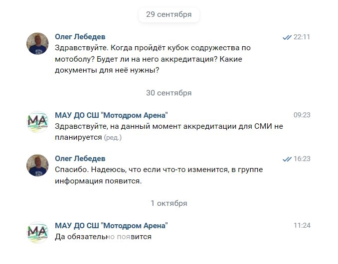 Стоит отметить, что в последнее время администрация мотодрома ввела аккредитацию. Однако именно на финале соревнований по мотоболу среди юниоров «Кубок Содружества» аккредитации не было, о чём свидетельствует переписка фотографов, которая оказалась в нашем распоряжении.