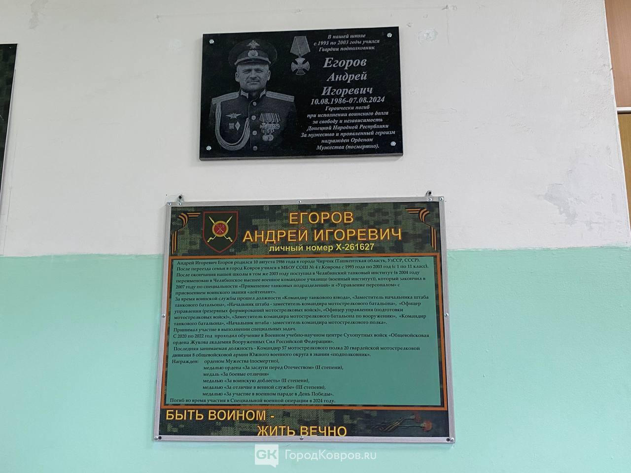 В ковровской школе №4 открыли мемориальную доску погибшему участнику СВО. Мероприятие посетили семья Андрея Егорова, представители патриотических организаций и городской администрации.