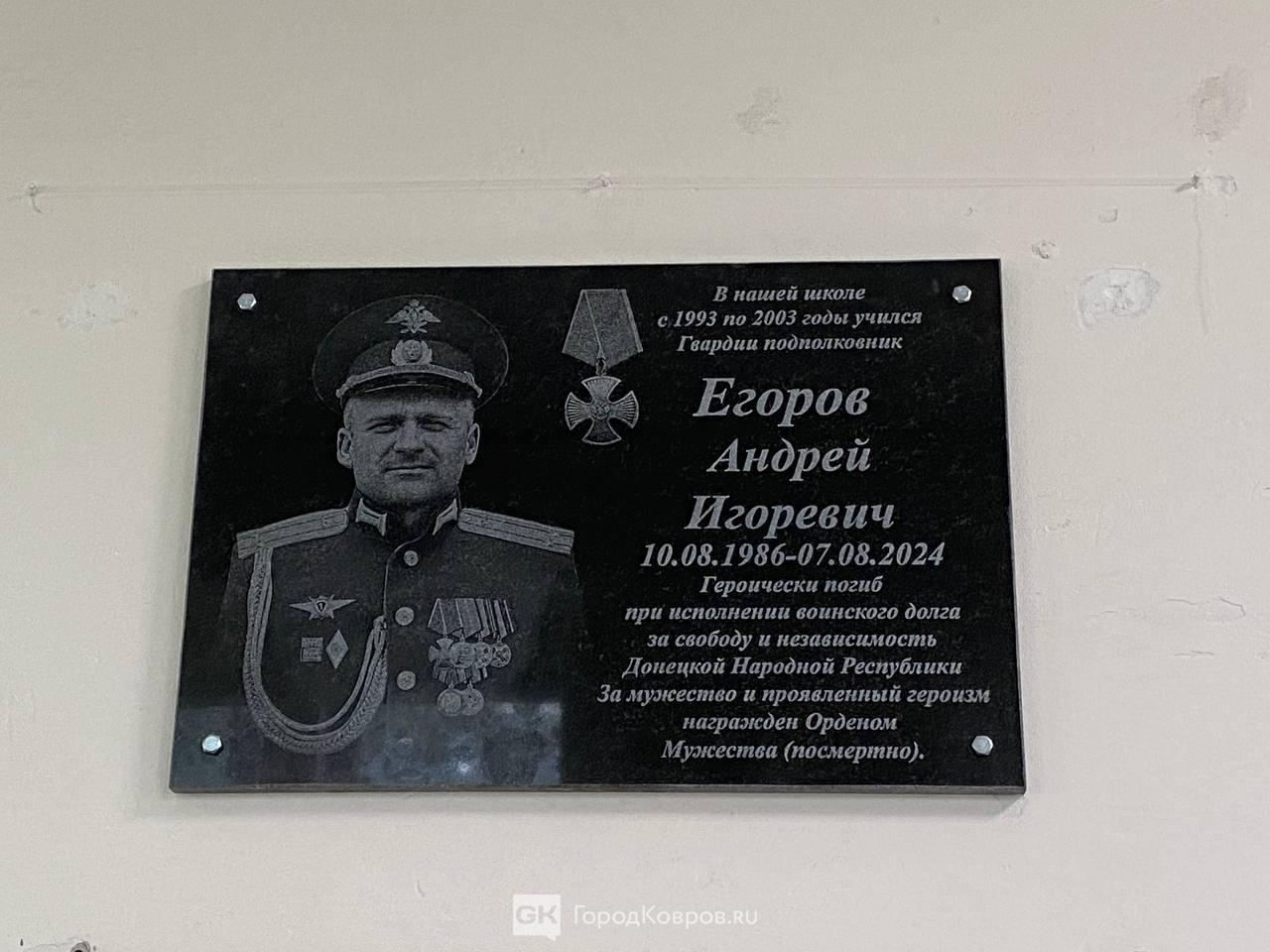 Военный в четвёртом поколении, он не дожил всего три дня до 38 лет. Андрей Егоров посмертно награждён Орденом Мужества. Награда высокая. Послужной список Андрея внушительный: медаль ордена «За заслуги перед Отечеством» І степени, медаль «За боевые отличия», медаль «За воинскую доблесть» ІІ степени, медаль «За отличие в военной службе» II степени и другие. Теперь в память о командире полка в школе №4 города Коврова, где он учился, открыли мемориальную доску.